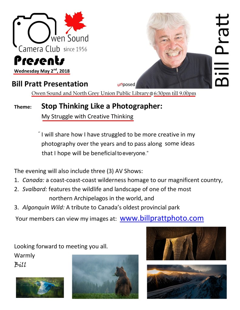 We’ll be hosting a presentation by Bill Pratt Wednesday May 2nd and the Owen Sound and North Grey Union Public Library, 6:30pm to 9:00pm. Find more details on the posters below (you can also read his Bio).