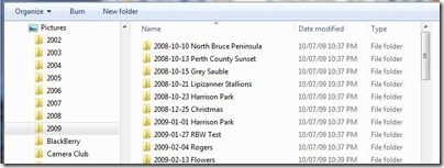 This is where the archiving style comes in. I create a new folder for every time I go out shooting, even if it’s just a few snapshots of some flowers in the back yard. The folder name will contain the date and the location that the photos were taken. For example, if I was to go a birthday party, the folder name may look like this: “2009-11-27 John Doe’s Birthday”. This tells me that the pictures were taken on November 27 at John Doe’s birthday party, and when I want to look them up on the computer at a later date, I just type in “birthday” in my search and they will show up in the results rather quickly.