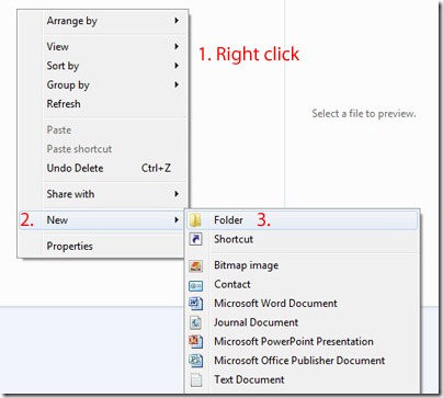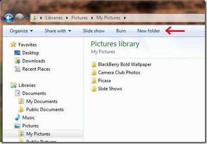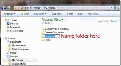 When creating an archiving system on a computer, the first thing I do before I even import my photos from my camera is start a new folder for storing the images I just took. In your Pictures folder, you can either click on the New Folder button in the menu at the top of the window as illustrated in the first image below, or just 1. right click anywhere in the window space and 2. select New, then when the pop-out menu comes up, 3. select Folder as in the second image.